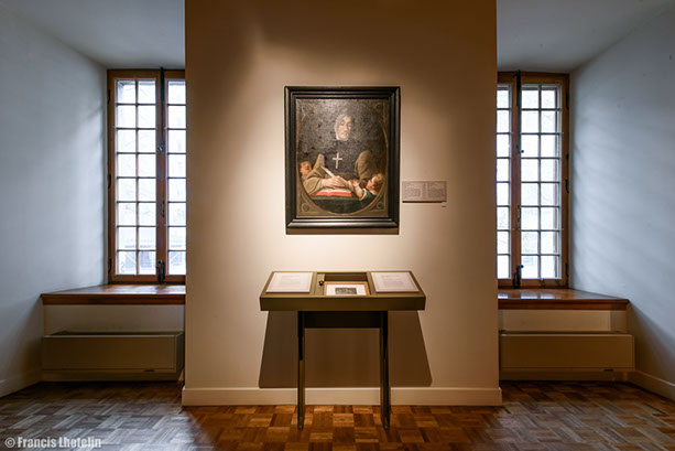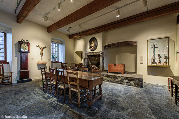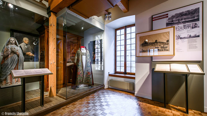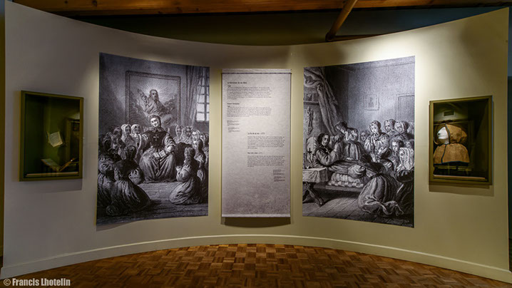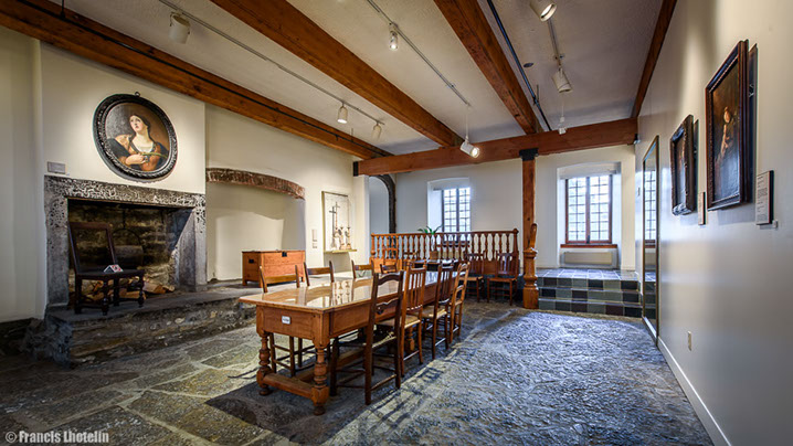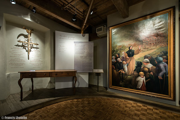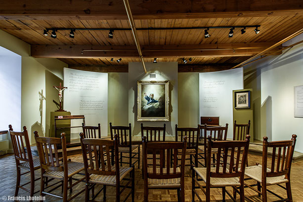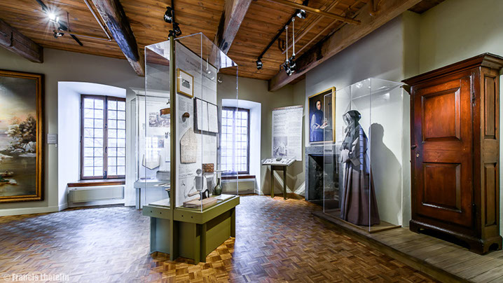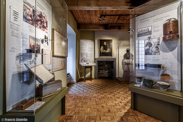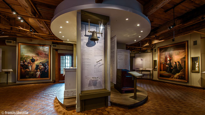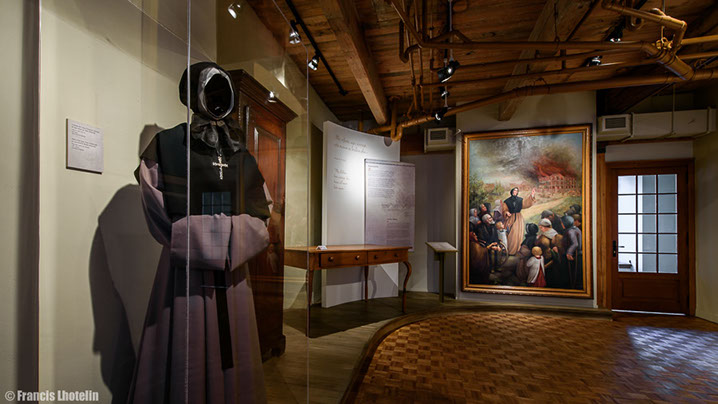 Les Sœurs Grises vous souhaitent la bienvenue à la visite virtuelle de l'exposition permanente « Marcher dans ses pas ». Cette exposition, a été présentée de 2004 à 2017 à la Maison de Mère d'Youville située dans le Vieux Montréal. Elle raconte l'histoire de l'Hôpital général des Frères Charron, de Marguerite d'Youville et des Sœurs grises de Montréal. Des travaux de rénovations majeurs sont présentement en cours à la Maison de Mère d'Youville pour la réalisation, entre autres, d'une nouvelle exposition permanente. Pour en savoir plus, suivez-nous sur Pour visiter l'exposition virtuelle, rien de plus simple! Les flèches du menu situé en bas ou le déplacement de votre curseur vous permettront de voir en 360 degrés chacune des salles. La navigation dans le parcours se fait en cliquant sur les étoiles qui vous guideront tout au long de la visite. Chaque étoile représente un point de vue différent sur la pièce. À chaque nouveau point de vue, vous pourrez cliquer sur des objets différents. Placez votre curseur sur les objets : s'ils s'illuminent, un clic de souris ouvrira une vignette explicative. Pour fermer la fenêtre, vous devez cliquer de nouveau dans celle-ci. Vous pouvez aussi utiliser le menu en haut à droite pour revenir sur vos pas ou vous déplacer vers une autre partie de la visite. Facebook.